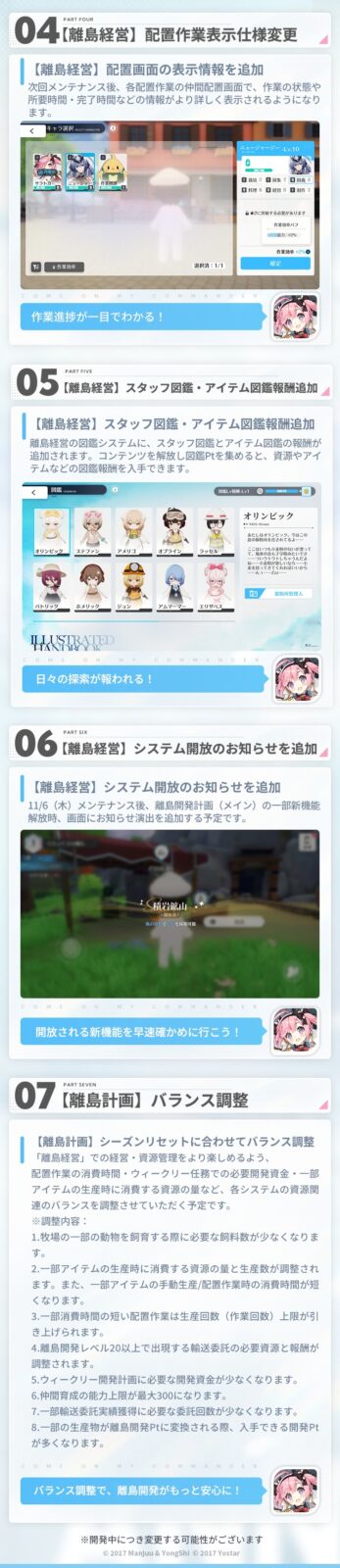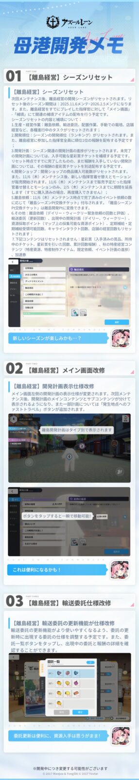 離島経営以外のコンテンツについても、今までいただいたご意見・ご要望に基づき、ゲーム仕様の改修を実施させていただく予定です。