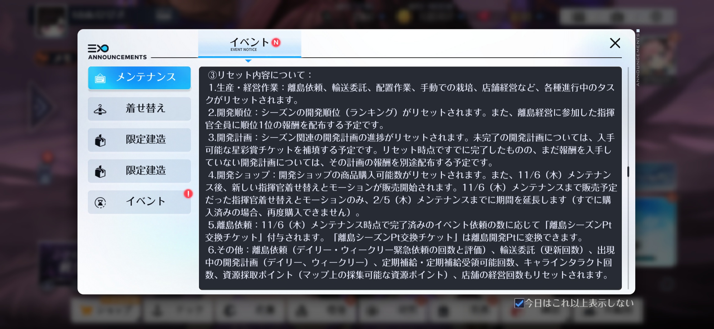 また、現段階の「離島経営」の準備不足により、指揮官の皆様にご満足いただけるコンテンツを提供できていない点を踏まえて、次のメンテナンス時に「離島開発シーズンのリセット」(詳細内容は続けて紹介する画像及びメンテナンス通知にてお知らせします)を実施させていただきます。