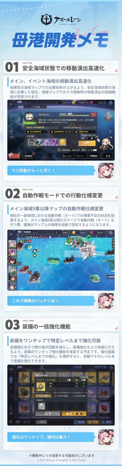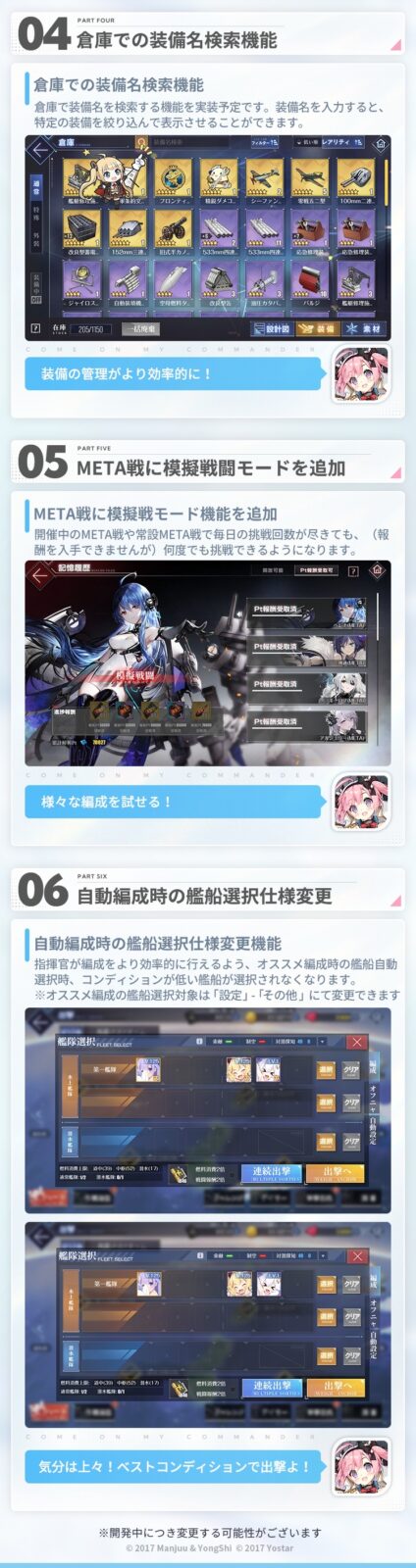 現在、開発チームと協力して、ご意見・ご要望をいただいた部分を含めた様々な問題点の改善と、その改善を指揮官の皆様に早めにお届けできるよう努めております。